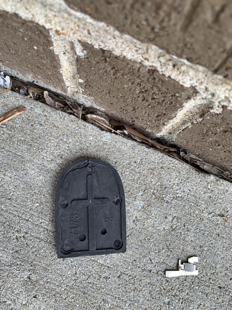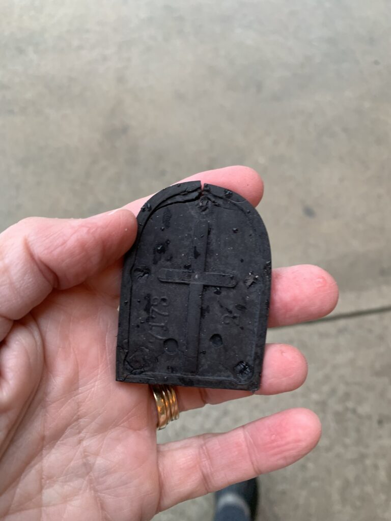 It was when I bent down to take a closer look that I noted the cross and saw it had numbers. I noticed the holes and a few dings and cracks and I thought to myself, “Yes, it’s been thru some stuff.” I took a picture (as I’m prone to do) scurried on inside and took care of what I’d come to accomplish. I glanced at it again on my way back out to the truck. The quiet thought occurred to me that I should stop and pick it up but I didn’t want to deal with any germs. I was just getting over a bad case of food poisoning.