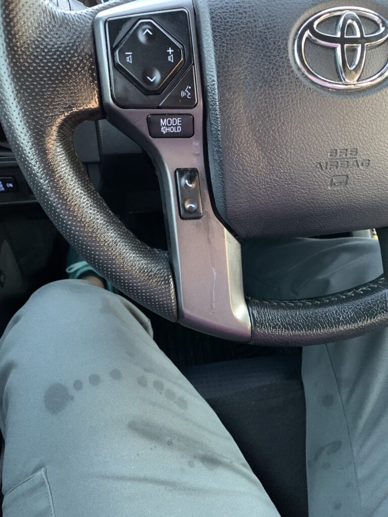So multi-tasking while weaving in and out of rush hour traffic, I grab some napkins out of the glove compartment and begin sopping up oil that’s splashed all along one side of the steering wheel, covered both of my hands, and soaked a spot on the cushion I’m sitting on. I can see it’s splattered on both legs of my britches, drizzling down the driver’s side door, and shaped a small puddle on the floor mat.