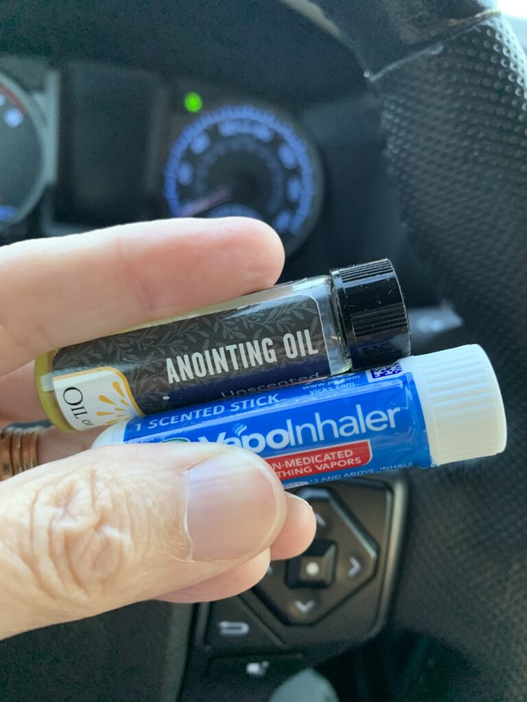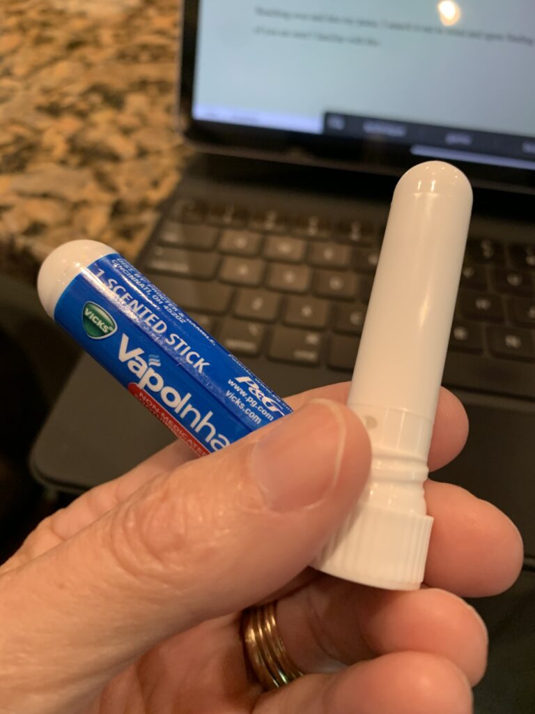 I immediately proceed to do just that. Reaching over and into my purse, I search it out in the blind, and with my eyes still fixed on the road, clasp it tight in my left hand, with my right give a twist. Now, for those of you are aren’t familiar with one of these, it’s a little chapstick sized thingee that gets opened upside down and held up to your nostril to sniff.