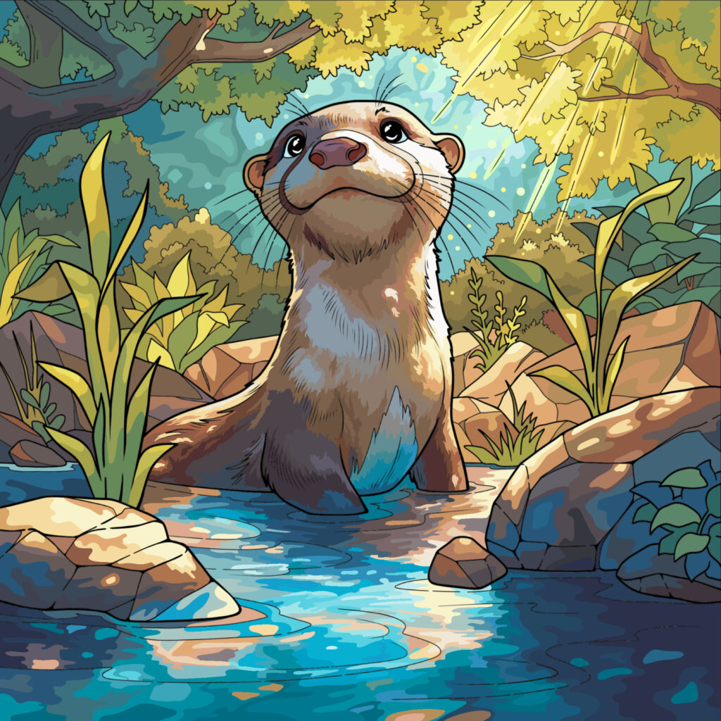 I just love the expression on this little otter’s face with its eyes looking upward so full trust. To me it has the most joyful, hopeful expression! Ah, to be bathed in the bits and streams of soft golden sunlight! Keen, the feeling of mutual adoration, set amongst tones of refreshing teals, tender brown, and peaceful olive greens. Bask in the moment, the purity of heart generated! Chords of Psalm 145 burst free from its chest!
