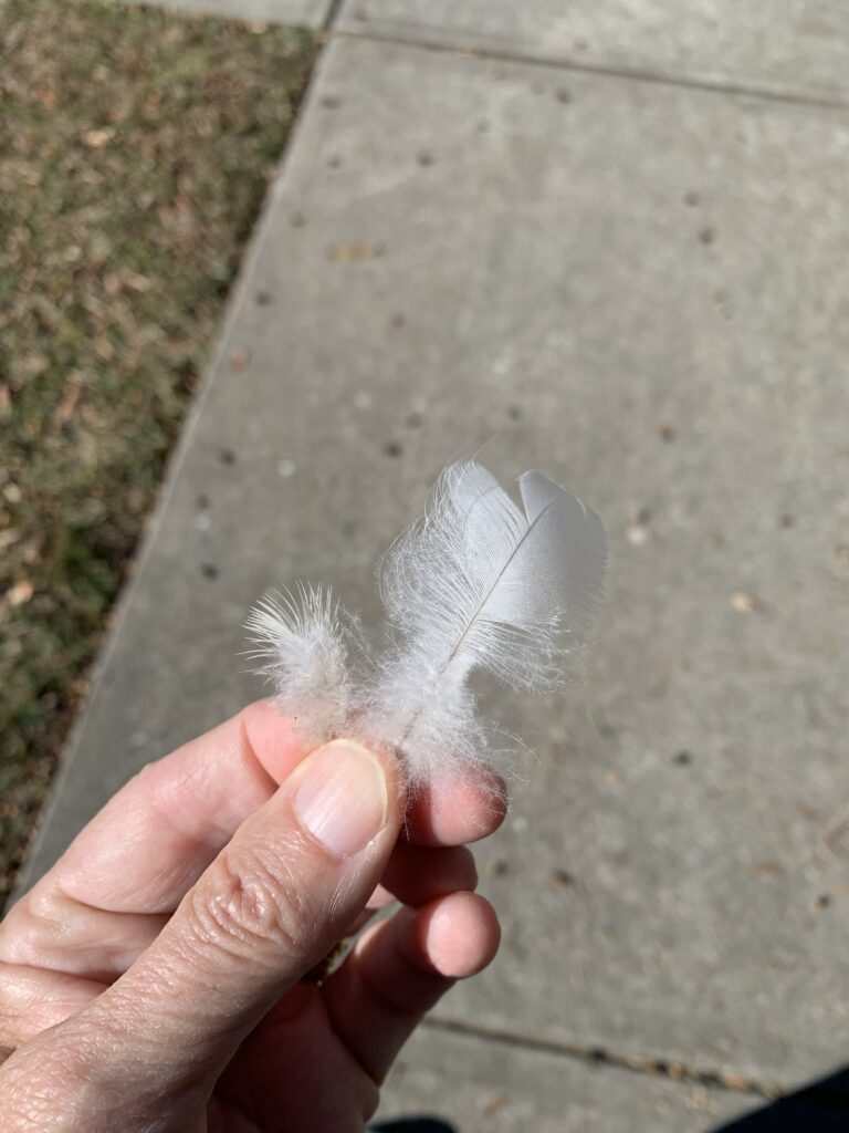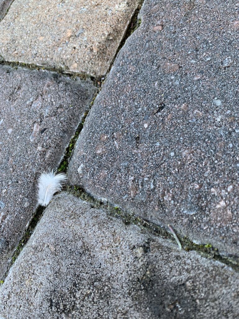 I redirect my energy. Not quite certain what it is that I’m supposed to do next, I get up, get dressed, brush my hair, brush my teeth…decide to start off simple, so simply follow my feet. They carry me over to the dining room window where I lift the shade to take a peek at what’s out there. Upon doing so, I spy a small feather; obvious in its white pristine as it rests in the cracks between the pavers.